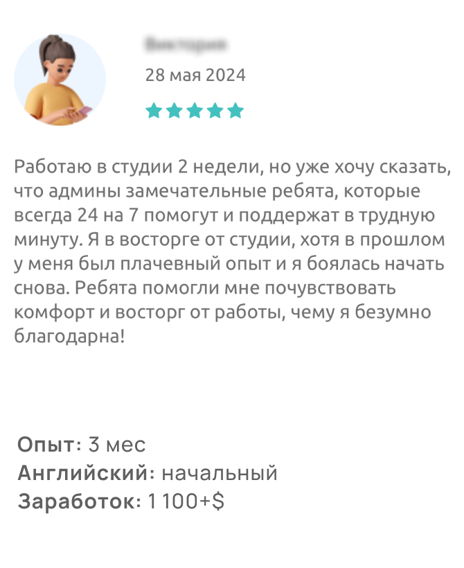 Если ты молода, энергична и открыта для обучения, то у нас есть, что тебе предложить! Наши администраторы имеют модельный опыт, очень хорошо обучены и регулярно обновляют свою базу знаний. И помни, мы даем обучение не только в первый месяц, мы хотим чтобы ты постоянно развивалась и повышала чеки!