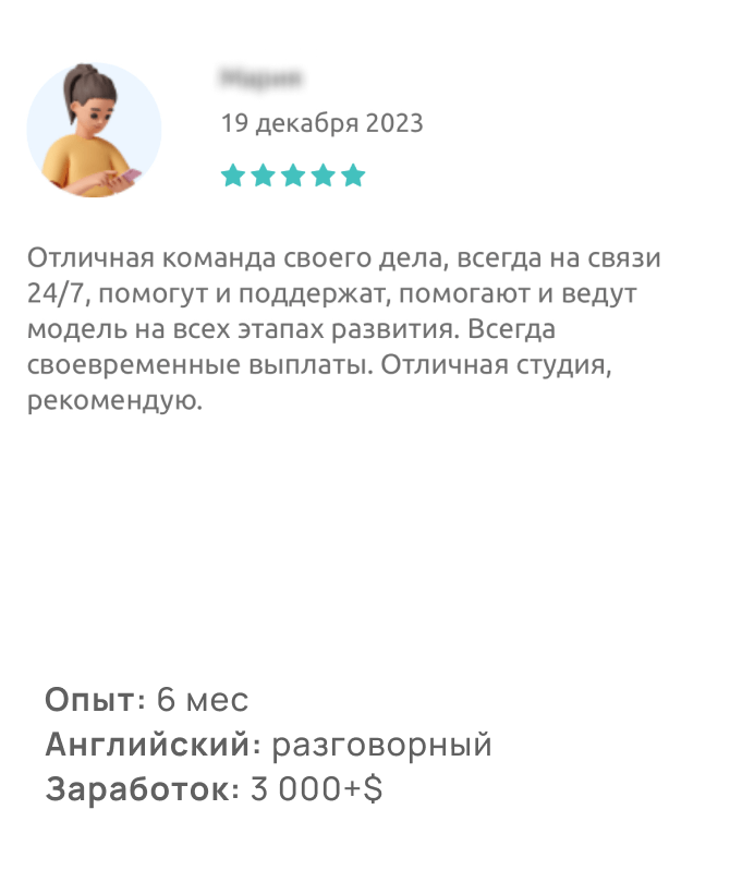 Помни, ты ведущая этого шоу. Ты задаешь тренд и удерживаешь внимание. Покажи свою энергичность и уникальность. Модели которые прошли качественное обучение, делают яркое и запоминающееся шоу и могут зарабатывать от 1 000$ за смену. Если у тебя уже есть опыт, но ты зарабатываешь меньше 2 000$ в неделю, то тебе точно к нам и поможем это исправить!