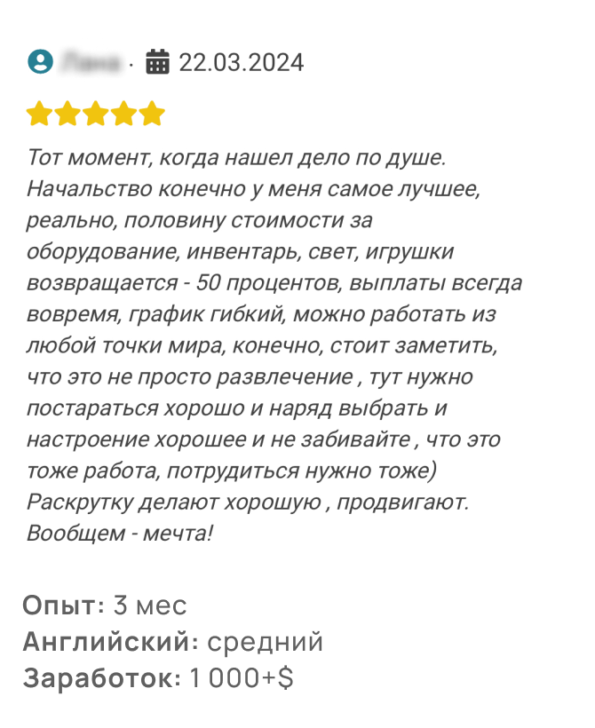Этого достаточно для проведения первых интересных эфиров и заработка первой 1 000$ в неделю. Продолжай учиться, работай стабильно и твои заработки будут значительно увеличиваться. Уже в следующем месяце ты сможешь выйти на новый уровень жизни, закрыть долги и уехать из Железногорска!